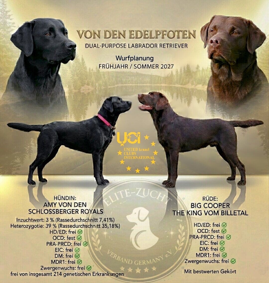 Wir erwarten aus dieser Verpaarung typvolle, gesunde Labrador-Welpen in schwarz und braun, die sowohl optisch als auch charakterlich überzeugen – freundlich, ausgeglichen, familienbezogen und gleichzeitig arbeitsfreudig.